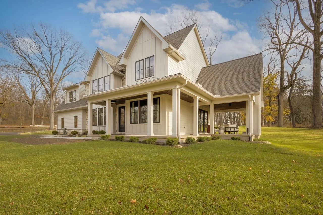A covered front and back patio surrounded by endless greenery and plans
